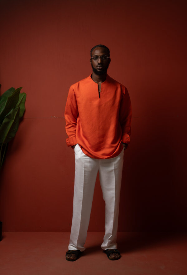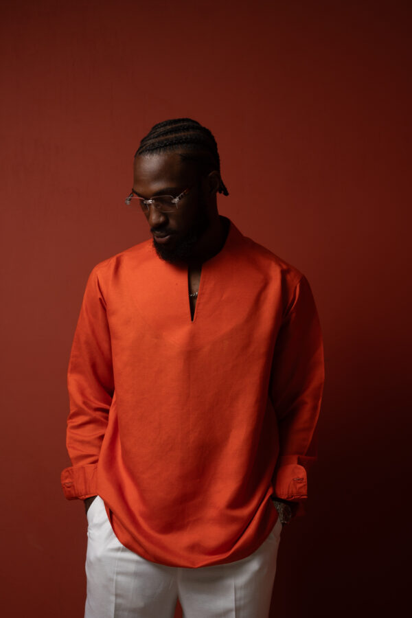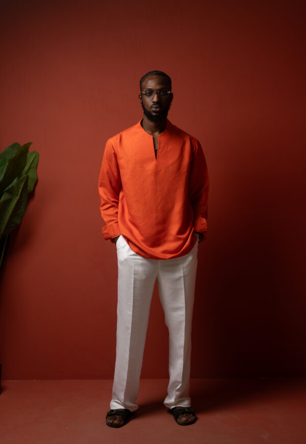 Cette tunique, d’un orange profond et lumineux, incarne la chaleur et la vitalité du style africain contemporain. Sa coupe droite, sans col, rehaussée d’une encoche au niveau du col, offre une élégance minimaliste et un confort absolu.