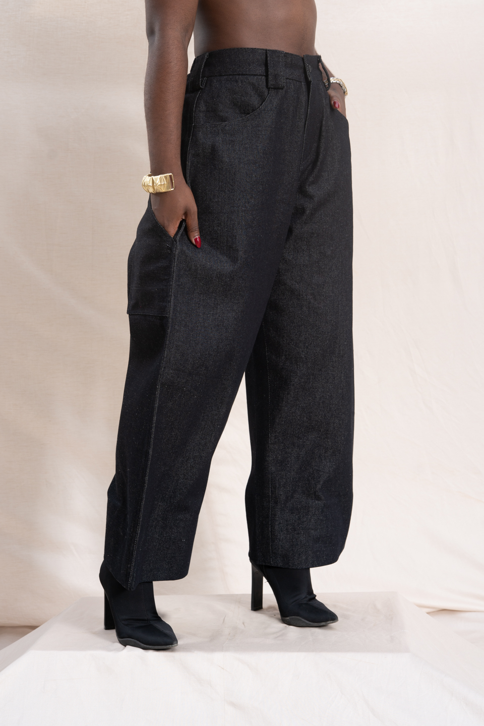 — Ensemble deux pièces (haut structuré + pantalon)— Denim noir premium— Coupe architecturale et contemporaine— Volume ample et tombé élégant— Finition soignée— Silhouette minimaliste et affirmée