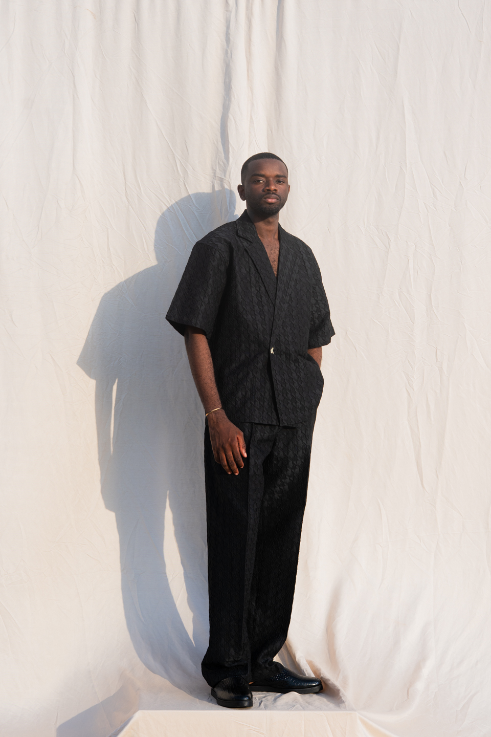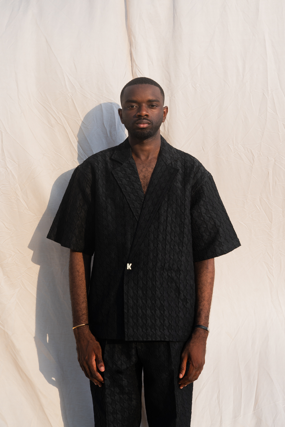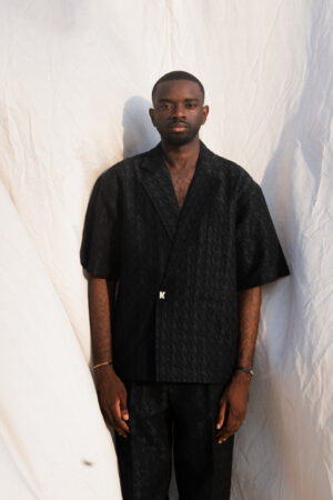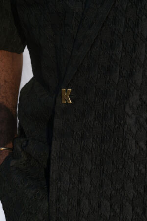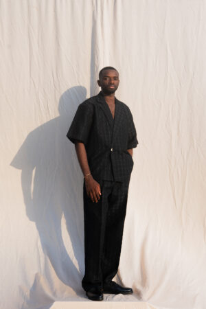 Cet ensemble noir revisite le tailoring avec une approche moderne et minimaliste. Confectionné dans un tissu texturé au relief subtil, il joue sur la profondeur et la lumière pour créer une silhouette structurée et affirmée.